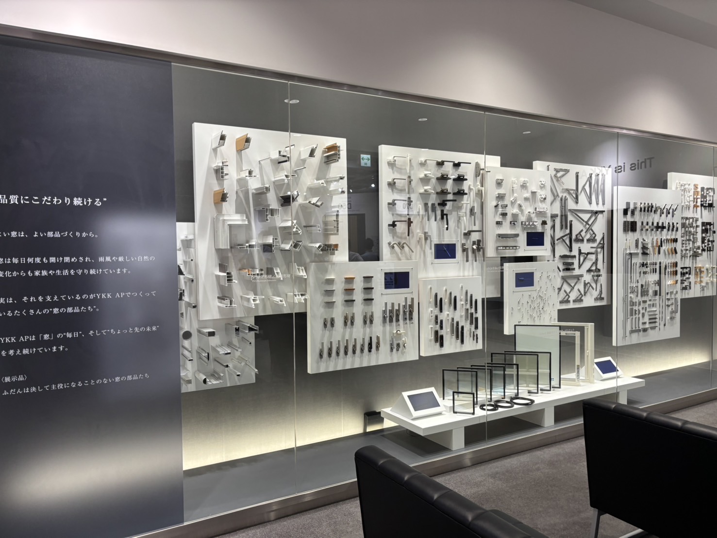 窓に使われる細かい部品がずらりと飾ってある展示ブースではYKKの長い歴史やものづくりへのこだわりのお話を聞きました。窓だけでもこれだけ部品があることにびっくりです👀✨