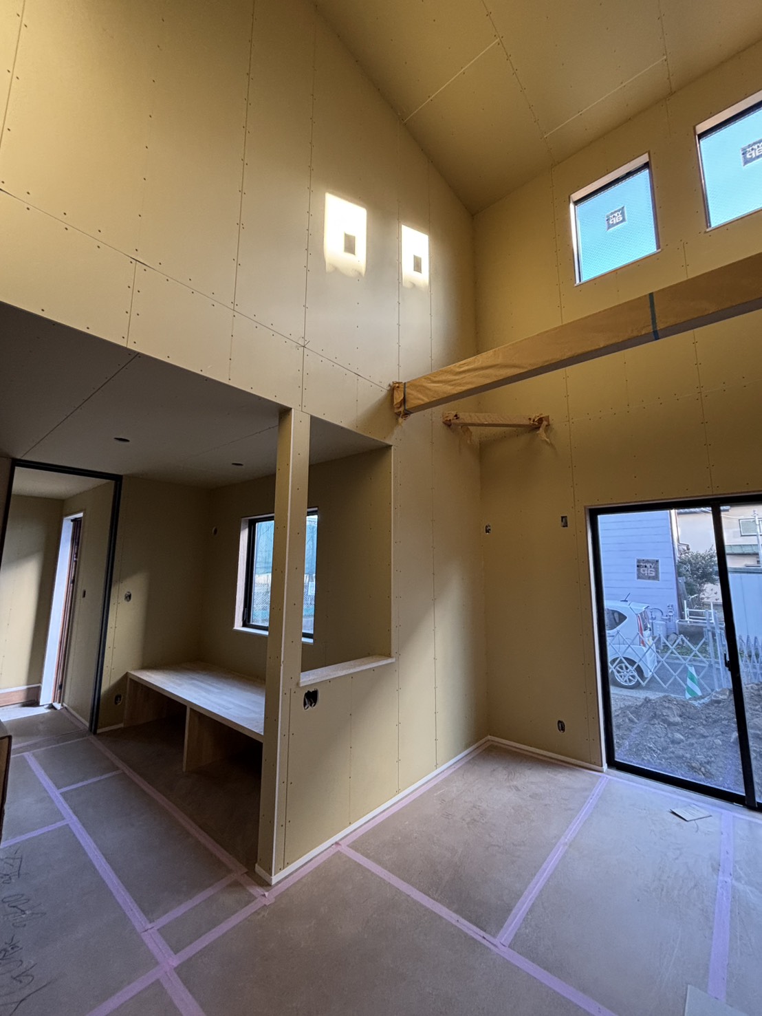 上棟が終わり、サッシがつき、電気の配管がされ・・・